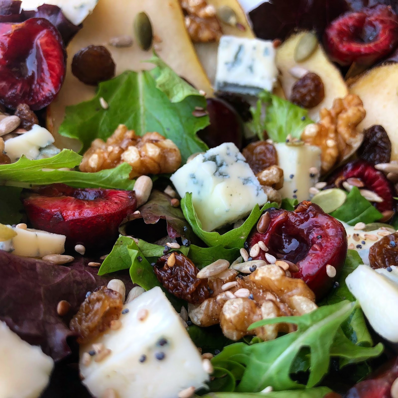 Aprovechando que estamos en temporada de cerezas, las he usado en la ensalada aparte de meterle la pera porque nos da aparte de su dulzor, un poco de acidez que compensa un poco el queso gorgonzola que muy graso, y la combinación junto con frutos secos como las nueces y las pasas, y semillas de amapola, lino, sésamo, pipas de girasol y de calabaza, ha sido fantástica.